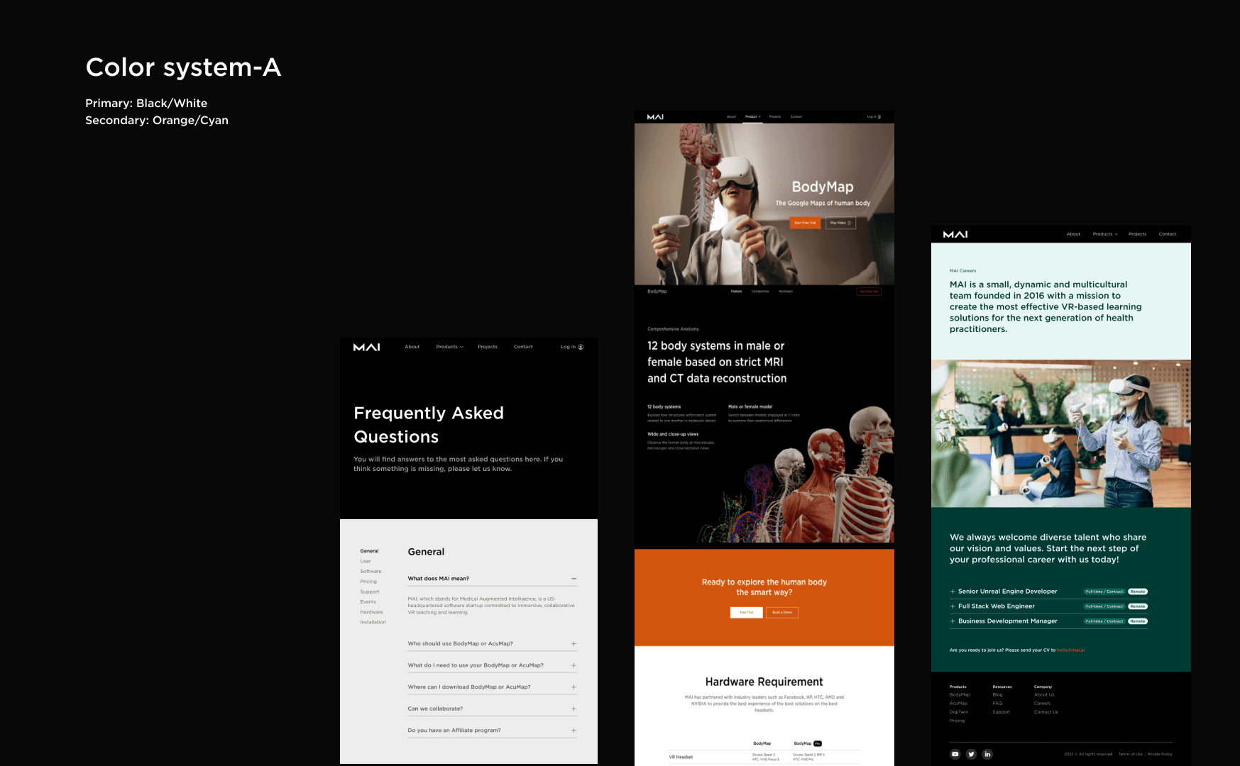MAI serves both B2B and B2C audiences, so the Portal needed a visual language distinct from its consumer-facing VR products. We defined a professional, functional, and system-oriented direction, using cyan as the primary color to differentiate it from the warmer consumer palette and anchor the design system.