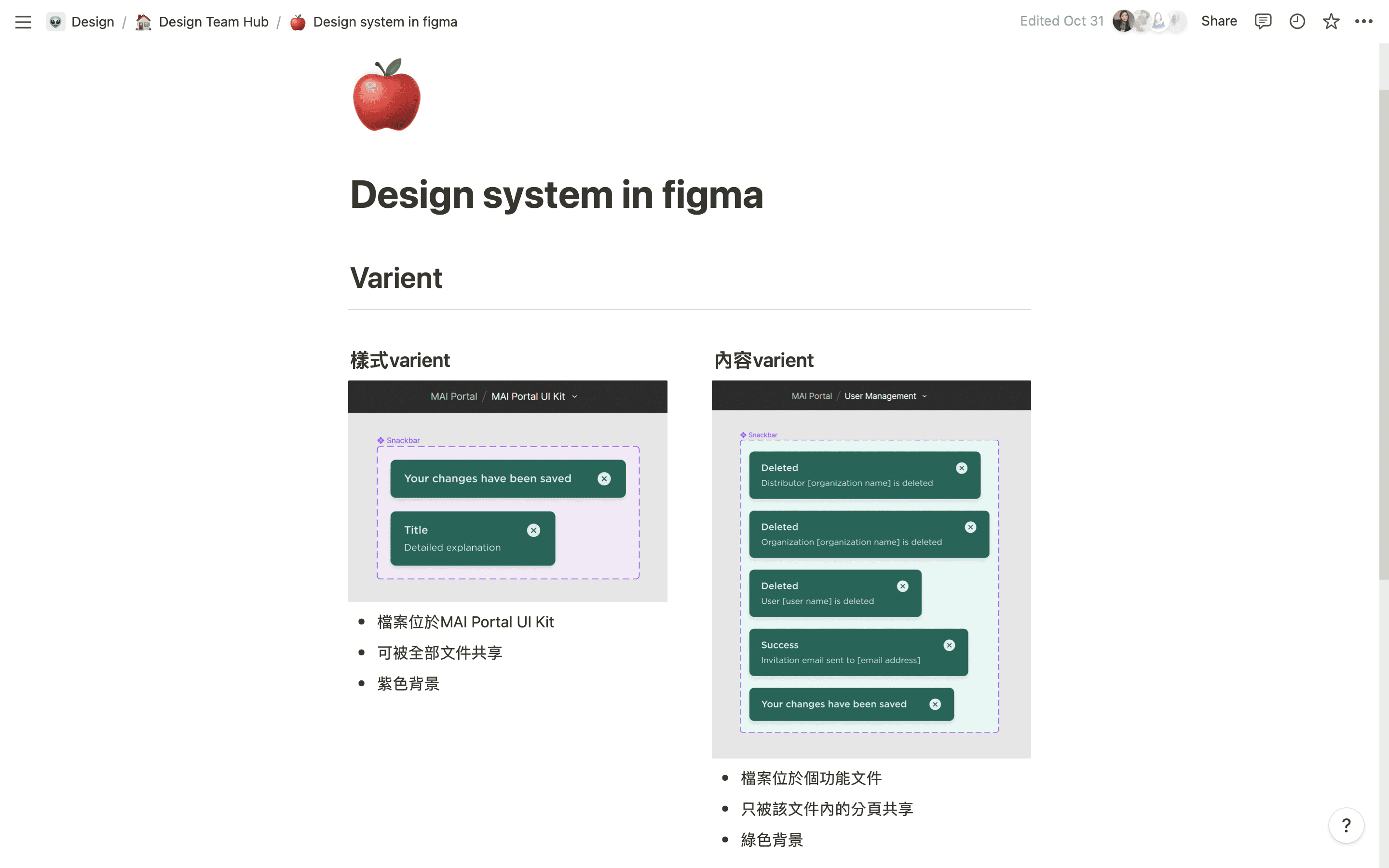 To keep the system scalable, I introduced a two-layer file structure: shared style variants lived in the MAI Portal UI Kit, while feature-specific content variants lived inside their respective product files. This allowed global updates to stay consistent across the platform while keeping local changes flexible and contained. For example, a snackbar component could be reused from the UI Kit and populated with different contextual messages in User Management without duplicating the base component.
