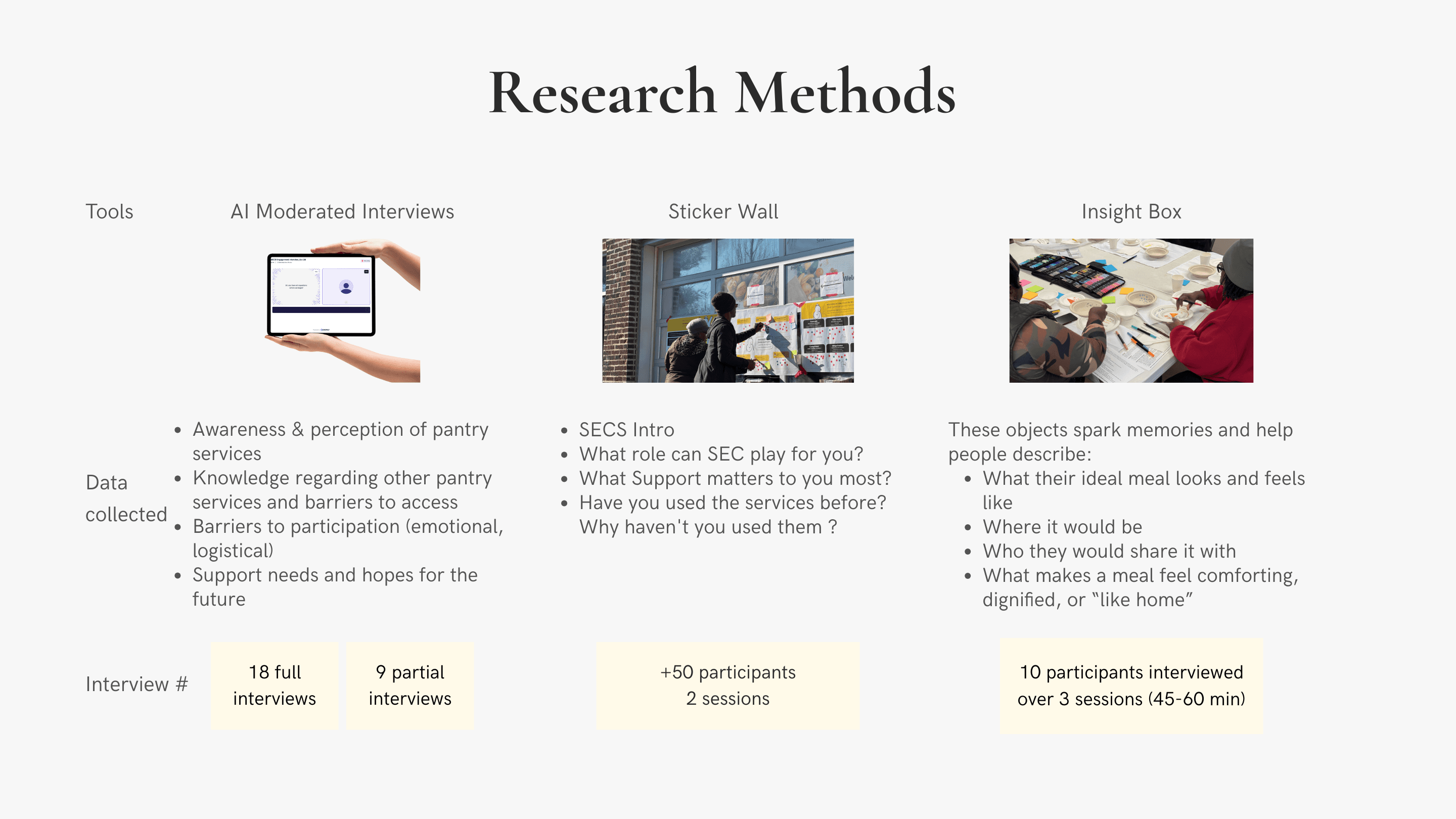 We adopted a qualitative participatory design approach focused on the UNDERSTAND stage of the design process, prioritizing community voices and lived experiences over purely quantitative metrics. Through a mix of rapid inputs, group-level patterns, and deeper narratives, we captured insights at multiple levels, making recurring themes more credible and actionable. Research was guided by a three-stage framework: Grounded Realities (current pantry experiences and access barriers), Transitional Insights (aspirations and readiness to seek support), and Future Envisioning (design opportunities for mobility as a social service).