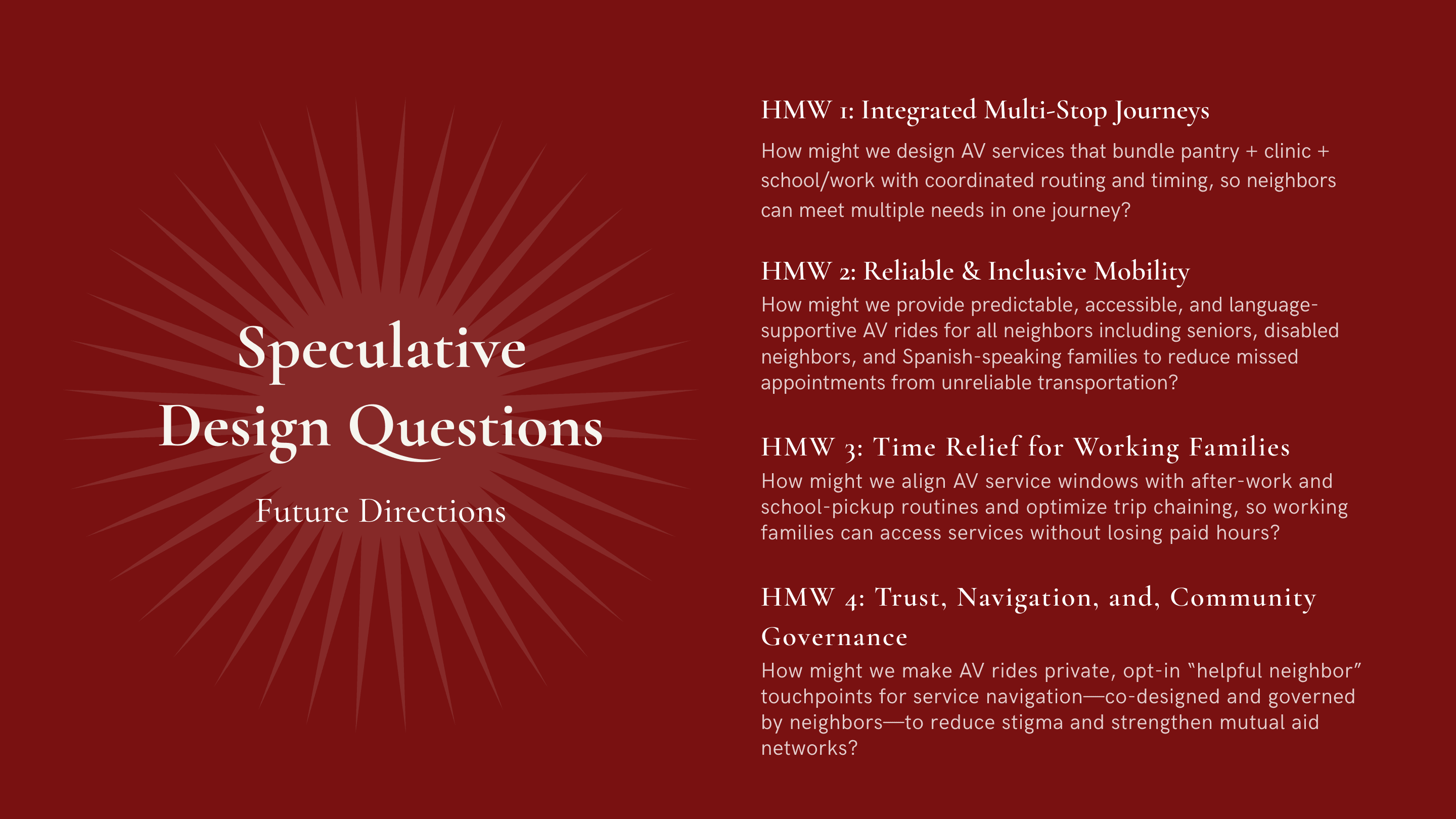 Grounded in our research, we synthesized strategic “How Might We” questions to guide the Spring 2026 speculative design phase, framing future mobility as a social service through the lens of lived experiences, values, and systemic needs.