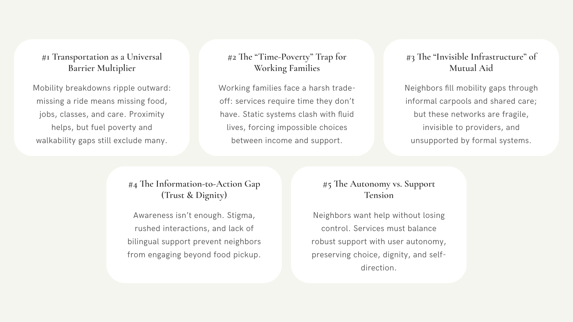 Our analysis revealed that mobility is not just a matter of transportation: it is the structural backbone of access. It shapes whether neighbors can engage not only with food pantries, but also with education, healthcare, job support, and community care. Reliable, dignified mobility is a precondition for participation in the broader social service ecosystem.