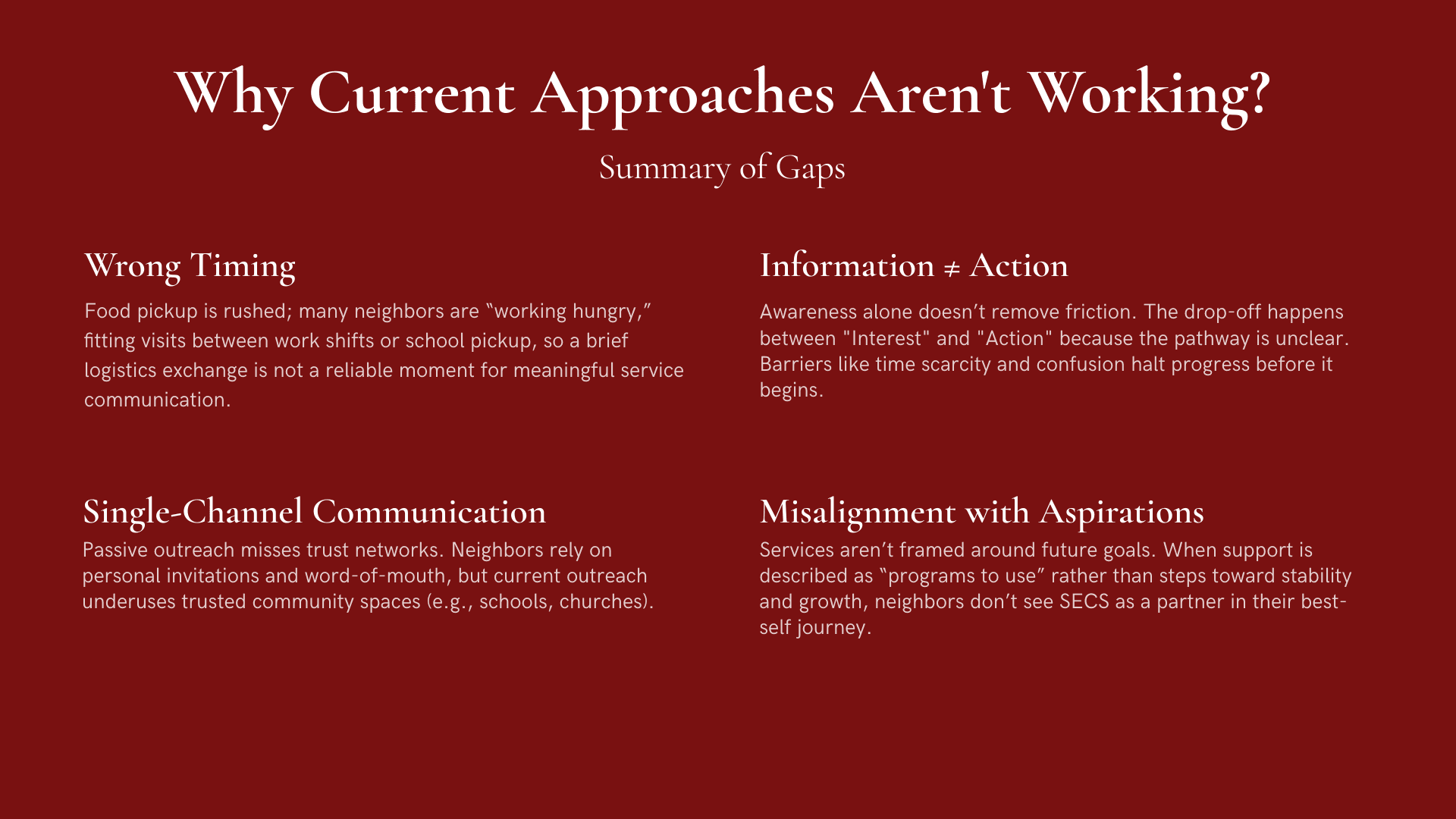 South East Community Services (SECS): Develop low-barrier engagement tools that community centers can use to better understand client needs, values, and aspirations.